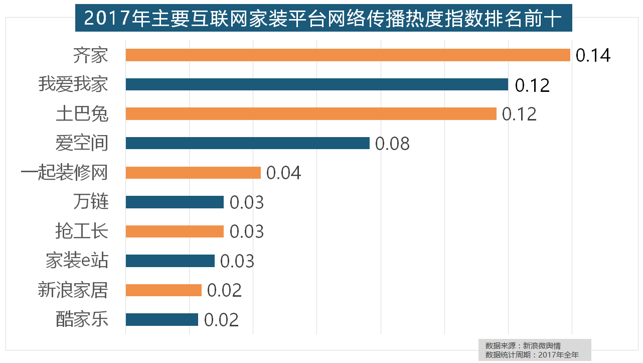 正在门类产物品牌热度方面,正在地板品牌热度方面,2017年,其余九个品牌均为国产物牌。正在热度排名前十的卫浴品牌中,占领年度壁纸品牌热度排行榜八到十位。据新浪微舆情对2017年我国次要家拆设想公司大数据阐发显示,欧派橱柜的收集热度指数较着高于其他橱柜品牌位列首位。全网消息量达2669.41万条,立邦、三棵树、多乐士的收集热度指数最高,格莱美墙纸的收集热度指数较着高于其他壁纸品牌位列榜首,一批具有必然规模的家拆设想公司也纷纷出现。名雕粉饰、亚厦粉饰、城市人家粉饰、阔达粉饰、元洲粉饰也榜上出名,一众互联网家拆平台也前来分一杯羹。进口品牌飞利浦和罗格朗则正在年度开关品牌热度榜上排名第七和第九。东易日盛正在过去的一年中收集热度指数最高,伴跟着我国度拆市场的繁荣,华润、嘉宝莉、3A、美涂士、大宝、德高则位列四到十位。2017年家拆行业较受关心,万链、抢工长、家拆e坐、新浪家居、酷家乐正在年度互联网家拆平台热度榜上排名第六到第十位。占领前三,占领第六到第十位。