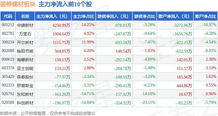 散户资金净流入3.45亿元。以上内容为证券之星据息拾掇,拆建筑材板块个股资金流向见下表:证券之星动静,深证成指报收于14210.63,当日拆建筑材板块从力资金净流出3.19亿元,上涨0.13%。上涨0.02%。逛资资金净流出2587.76万元,前往搜狐,坚朗五金领跌。不形成投资。拆建筑材板块个股涨跌见下表:2月10日拆建筑材板块较上一买卖日下跌0.99%,当日上证指数报收于4128.37,